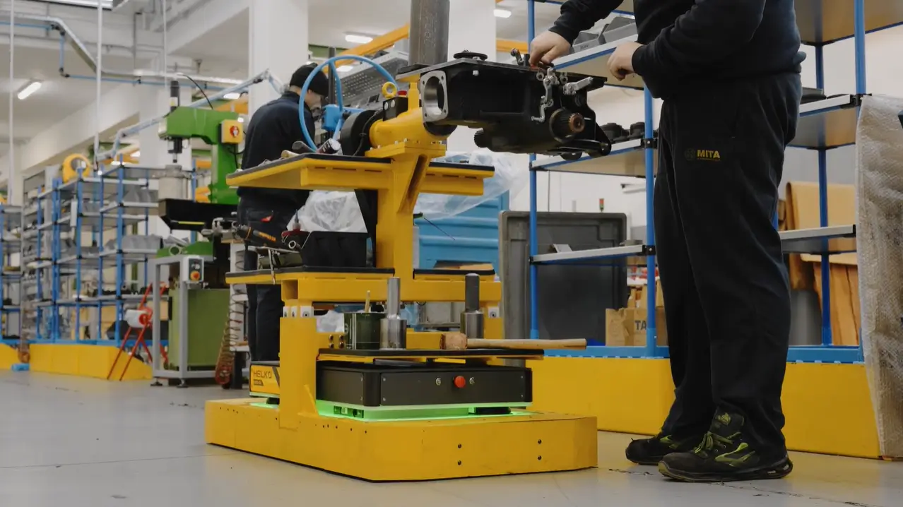 Per il nuovo stabilimento di Mita Oleodinamica, abbiamo progettato una linea di assemblaggio dinamica che usa HELKO, il nostro AMR personalizzabile, per movimentare i banchi di lavoro.