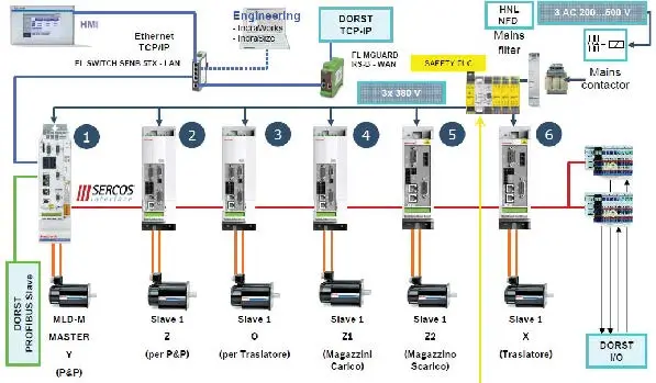 - comunicazione con 2 nodi remotati Bosch per gli I/O digitali e sincronizzazione su rete SERCOS per il controllo real-time dei movimenti;